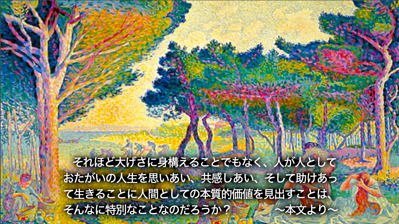 それほど大袈裟に身構えることでもなく、人が人として、おたがいの人生を思い合い、共感し合い、そしてたがいに助け合って生きることに人間としての本質的価値を見出すことは、そんなに特別なことなのだろうか? 余分にものを持っている人が、不足している人に分け与え、補い合って共に生きることが常識になっている仲間どうしの価値共有世界、そういう世界の実現は、そんなに困難なものなのだろうか?